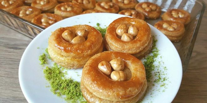 Çay bardağı ile hamuru yuvarlak şekillerde keselim ve yağlamış olduğumuz tepsiye dizelim. Üstlerine fındık koyarak ortalama 170 derecelik fırında pişirelim. Tepsinin üstünü de yağlı kağıt ile kapatalım ki pişirme esnasında üst yüzeyleri kurumasın. 15 dakika kadar pişirdikten sonra kağıdı alıp üzerleri kızarana kadar pişirelim ve hafifçe kızardığında fırından alalım. 5-6 dakika kadar beklettikten sonra soğumuş şerbeti tatlıların üstüne güzelce dökelim. 6-7 saat kadar şerbetli şekilde bekletelim ve sonra ikram edelim. Afiyet olsun.