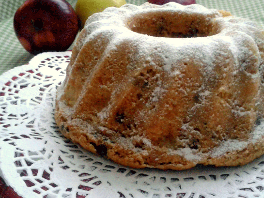 7. Kek karışımını kalıba boşaltın, ince ince kestiğiniz elma dilimlerini kekin üzerine batırın. Fındık kırıklarını ve üzümleri üzerine serpip önceden ısıttığınız fırına verin.