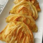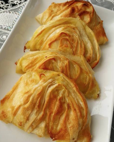 Yufkayı 4 e kesip soslayalım videodaki gibi sarıp iç malzemeden koyup yumurta sarısı sürelim.180 derecede pişirelim.Afiyet olsun
