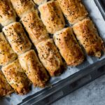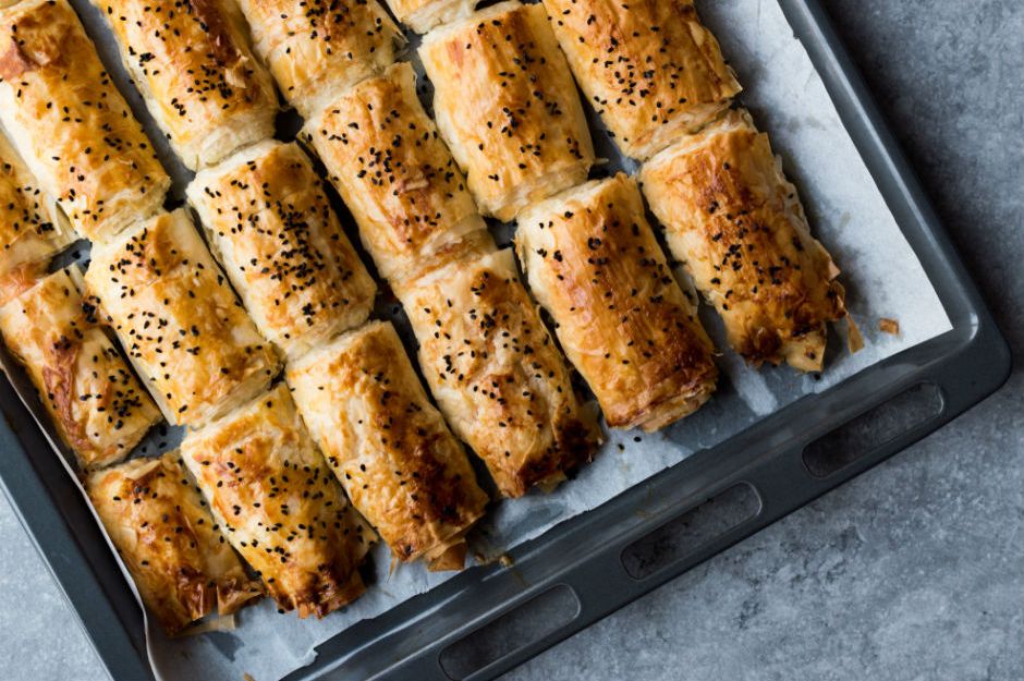 maden suyu krema ve sıvı yağı bir kaba alıp iyice çırpalım 1 adet yufkayı tezgaha serelim her yerine gelecek şekilde sos sürelim ardından üzerine 1 adet yufka serelim ve tekrar heryerine gelecek şekilde sos sürelim ve üçgen şekilde keselim iç harcını ekleyip rulo yapalım diğer 2 yufkayı da aynı şekilde hazırlayalım kalan 1 yufkayı yağlayıp ortadan ikiye katlayıp üçgen şekilde keselim iç harcını ekleyip rulo yapalım 1subardağı su ve Yarım çaybardağı sıvıyağı bir kapın içine alıp karıştıralım ve börekleri bu sosa bulayıp yağlanmış fırın kabına alalım önceden ısıtılmış 180°alt üst ayarda pişirelim altı üstü kızarınca fırından alalım Afiyet olsun