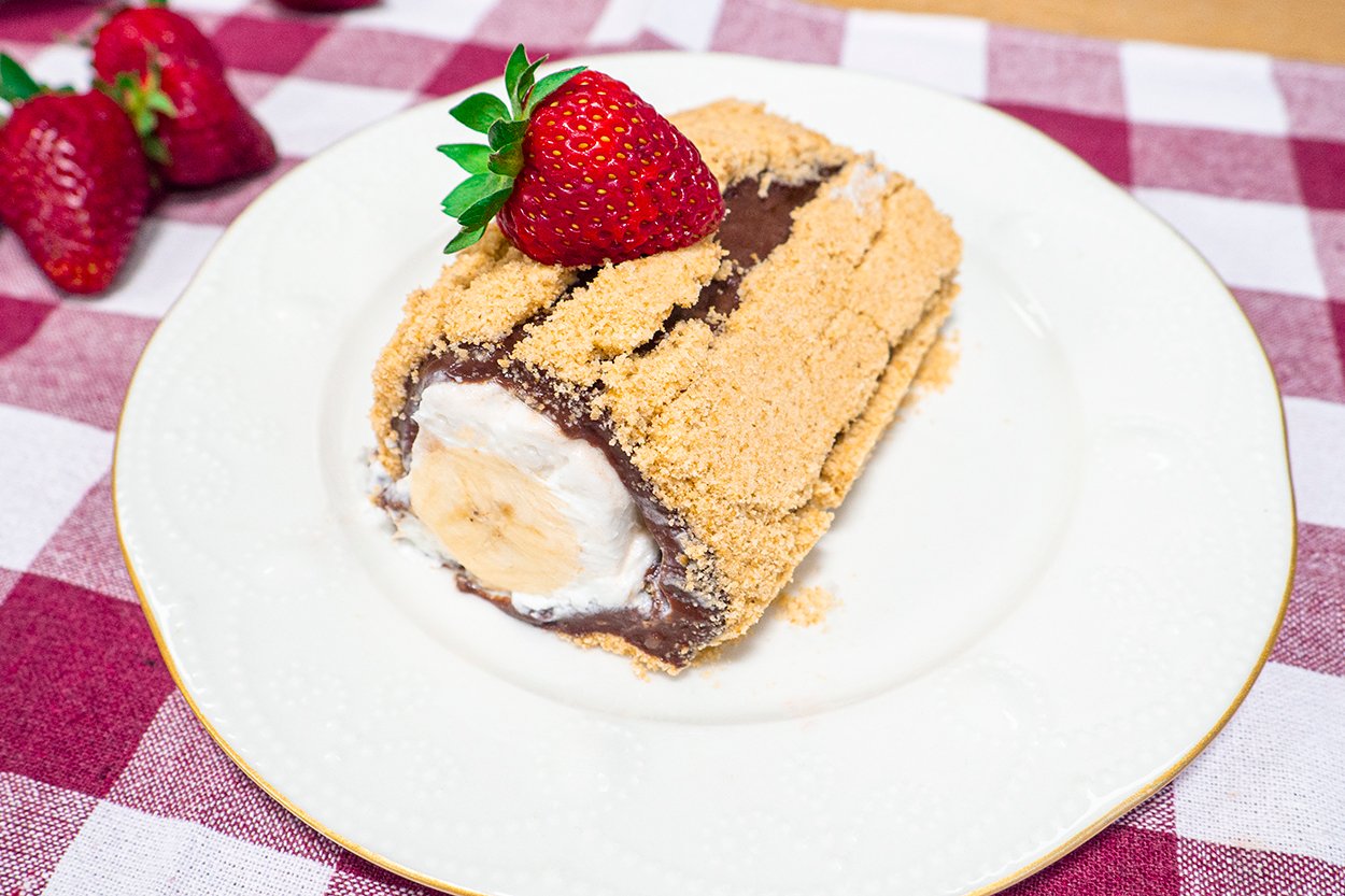 ( sararken bir elimle pişirme kağıdının ucuna tutup bir yandan muza tutup sıkıca tam tur sarıyoruz, mümkün olduğunca kremaya ve bisküvili alana dokunmayalım)