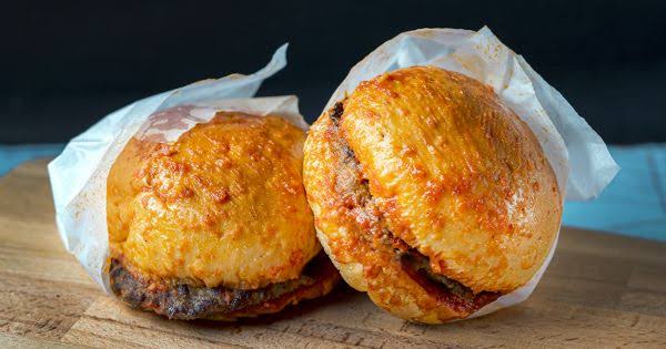 Köfte için gerekli olan malzemeyi bir yoğurma kabına alıp yoğurun. İri parçalar kopartıp hamburger köftesi şekli verin. Yağsız tavada pişirin.Sosu için zeytinyağı hariç tüm malzemeyi blenderdan geçirip püre haline getirin. Zeytinyağını tavada ısıtın. Domatesli sosu ilave edip kaynatın.Hamburger ekmeklerini ortadan ikiye kesip pişen domatesli sosun içine batırıp çıkarın. İçlerine köfteleri yerleştirin.Köfteleri pişirdiğiniz tavaya iyice ıslatarak yağlı kağıt koyun. Hamburgerleri ıslak fırın kağıdının üzerine koyup tavanın kapağı kapalı olarak ekmekler iyice yumuşayana kadar birkaç dakika pişirin. Sıcak servis yapın.