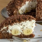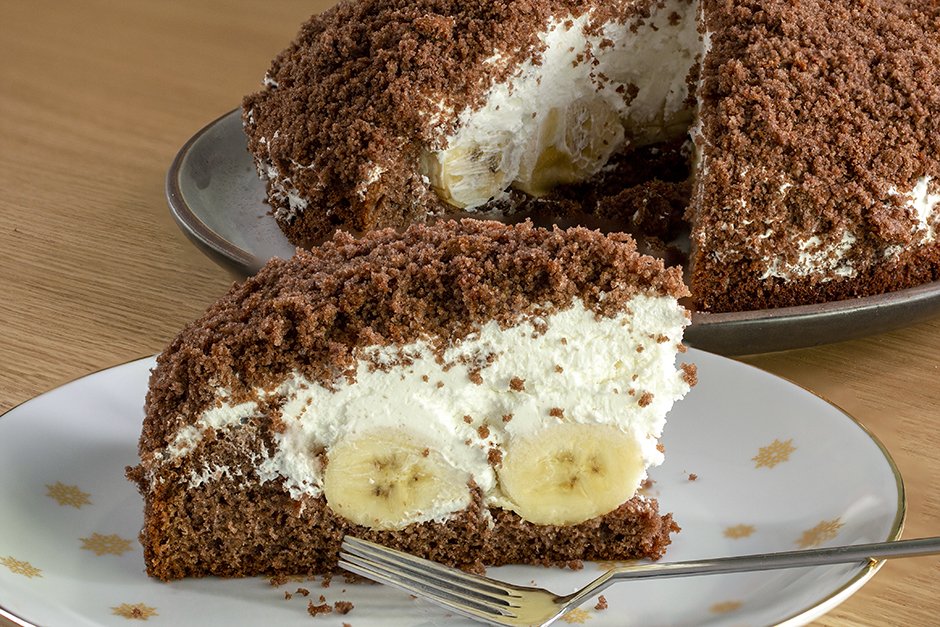 Kek için yumurta ve şekeri köpürene kadar 4-5 dk çırpın. Sonra sıcak su ekleyip çok az çırpın. Kuru malzemeleri de eleyerek ekleyip çok az çırpın. Yağlı kağıt serili fırın tepsisine kek harcını döküp yayın. 170 derecelik fırında pişirin. Kek ince olduğu için kısa sürese pişer kontrollü pişirin kurumasın. Kürdanla kontrol edin. Büyük boy pasta yapacaksanız büyük bir kalıpla keki kesin kalanını üzeri için rondodan geçirip toz haline getirin ya da küçük kalıpla kesip porsiyonluk hazırlayabilirsiniz. Keki çok az sütle ıslatabilirsiniz. Kremayı önce kenarına biraz sıkın. Ortasına çikolata sos ve muz dilimi koyun. Tekrar kremayla tamamlayın. Üzerini toz haline getirdiğiniz kekle kaplayın. Buzdolabında en az 2-3 saat soğutun afiyet olsun