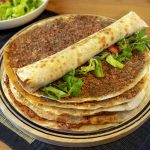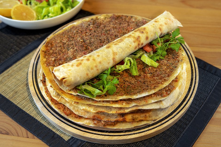 Bir mutfak robotunun içinde iç harcı için baharatlar, salça sıvı yağ ve kıyma hariç tüm malzemeleri alın ve çekin. Maydanozları en son ilave edin. Rondonun içinden büyükçe bir kaba aldığınız harca baharatları, salçayı ve sıvı yağıekleyip iyice karıştırın. Son olarak kıymayı ekleyerek güzelce yoğurun.Lahmacunun lezzetli olması için harcınızın cıvık bir kıvamda olması gerekir. Yeteri kadar cıvık bir kıvamda değilse, biraz su ekleyebilirsiniz. Harcınız dinlenirken, hamurunuzu yapmaya başlayın. Suyu bir kaba dökün, üzerine tuz ve şekeri ilave ederek güzelce karıştırın. Azar azar da un ilave edin. Unu yavaş yavaş suya ekleyerek orta sertlikte bir hamur elde edene kadaryoğurun. Hamurunuz orta sertliğe ulaşınca tezgahın üzerine alıp en az 5 dakika daha yoğurun.Hamuru bir silindir haline getirip eşit parçalara bölün. Aynı büyüklükte lahmacunlar