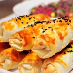 Yağlı kağıt serili tepsiye serin. Üzerine bir yufkagı dizip sostan gezdirin. Sonra 1 yufka daha koyup tekrar sos. Sonra patatesli harcı her tarafa yayın. Sonra tekrar yufka üzetine sos, son yufka sos kaldıysa gezdirin. En üst için tekrar milföyleri aynı şekilde açıp üzerine kapatın. Dilimleyin. Üzerine sostan çok az kalmıştı 1 yumurta sarısı daha ilave edip çırpıp onu sürdüm.