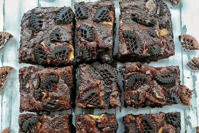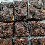 Kelepçeli kalıbın tabanına yağlı kağıt serdim.browni karışımının yarısını döktüm ve ara kata doğradığım negroları ekledim.kalan browni karışımınıda ekleyip 180 derecede pişirelim..
