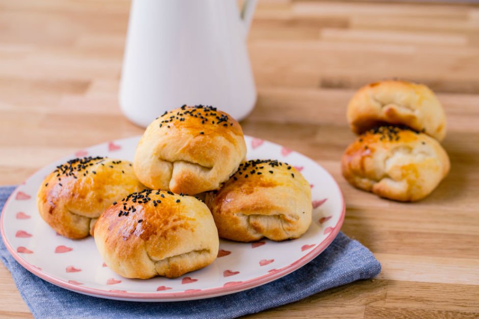 Üzeri için için; 2 yumurta sarısı, 1 silme çay kaşığı pudra şekeri, 1 tatlı kaşığı süt hepsini karıştırıp poğaçaların üzerine sürün.