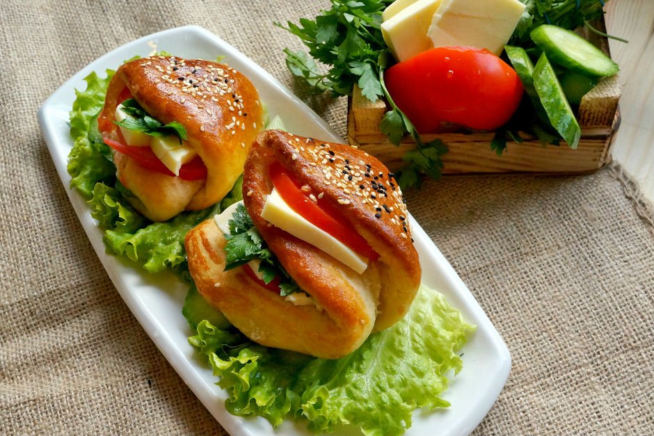 Tüm malzemeler karıştırılıp azar azar un eklenip yumuşak bir hamur hazırlanır. Üzeri kapatılıp mayalanmaya bırakılır. Sonra hamurdan cevizden biraz büyük bezeler alınır ve tezgahta yuvarlak açılır yaklaşık pasta tabağı veya fincan tabağı büyüklüğünde, sonrasında üzerine sıvıyağ sürün ikiye katlayın, ikiye katladıktan sonra tekrar sıvıyağ sürün ve 4 e katlayın. (Sıvıyağ piştikten sonra aralarının açılmasını sağlıyor sandviç ekmeği olarak kullanacağımız için. ) Ve yumurta sarısı sürüp 200 derecelik fırında üzeri pembeleşene kadar pişirilir. Sonrasında her katını domates peynir salatalık ile lezzetlendirin.